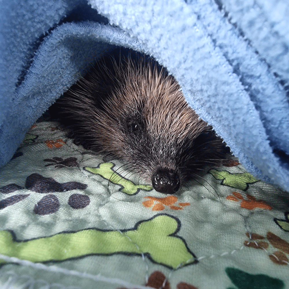 This little 'Bram' rescued on 9th December from a garden in Cleveleys after he was seen wobbling from side to side and struggling to walk due to hypothermia. One of this year's youngsters he is severely underweight weighing just 270gms. Hypothermic and dehydrated, he is just skin and bone, there is nothing of him. He would not have survived another day on his own. Now nice and warm and receiving treatment for a really bad tummy along with replacement fluid therapy.