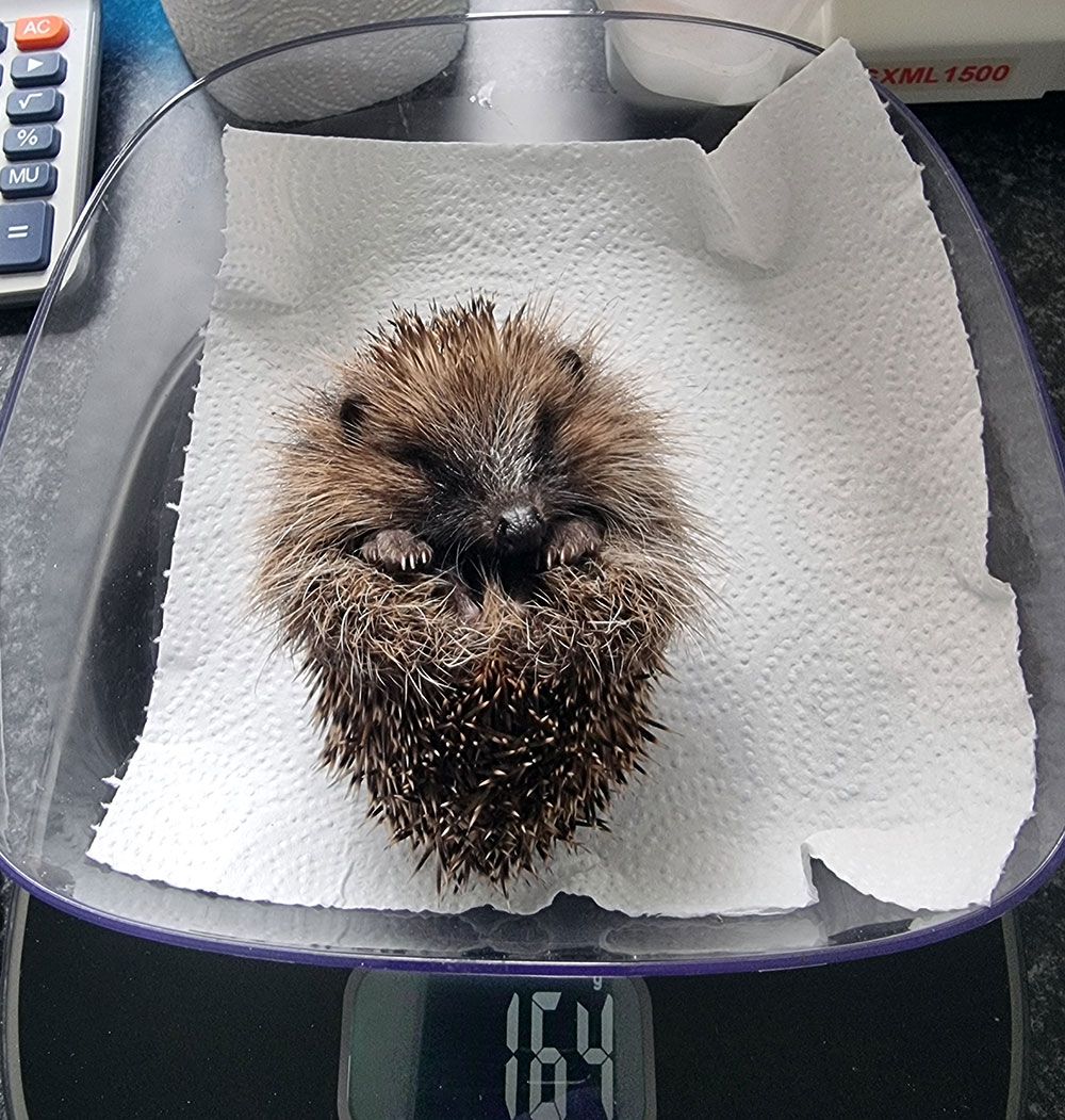 Baby 'Cleo' 4/5 weeks old and weighing just 164gms was admitted after being found out during the daytime on her own. Very poorly with severe diarrhoea and worm burden. Now on drip fluid replacement and antibiotics. Worming procedure will start later when she is rehydrated. A hedgehog's back end should be nice and round, you can see how underweight she is as her back end is very pointed.